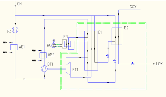 The gaseous nitrogen goes into the circulating nitrogen compressor to be compressed, and then the compressed nitrogen flows into the expander to raise the pressure, and into the water cooler to be cooled, and then it enters into hot end of the main heat exchanger in the liquefier cold box. The cooled gaseous nitrogen is extracted to the chiller to be cooled again, and then it goes into the main heat exchanger. Most of the gaseous is extracted from the heat exchanger to turbo expander for expansion refrigeration. The expanded low pressure gaseous nitrogen enters into cooling drag flow circulating nitrogen through the cold end of the main heat exchanger, and after being rewarmed, it goes inot the inlet of circulating nitrogen compressor to follow the next circulation. The rest gaseous nitrogen is still be liquefied in the main heat exchanger, and goes into the oxygen liquefier to cool the oxygen supplied by the user, and part nitrogen is extracted returned to the main heat exchanger to cool the drag flow gas, and after going out of the main heat exchanger, it mixes with the low pressure nitrogen from the oxygen liquefier, and then goes into the circulating nitrogen compressor to conduct next circulation. The instrument control system of the liquefier employs independent control system, which realizes the integration control of central control, local control and on-site control, and can effectively monitor the production process of the complete set of air separation plant.