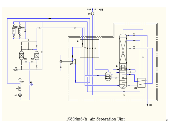 The process employed by this air separation plant utilizes molecular sieve to purify air at normal temperature, production of refrigerating capacity by booster expansion turbine; and the fractionating column utilizes structured packing.