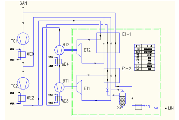The low pressure nitrogen provided by the user is compressed through the gas transmission section (I section) of nitrogen turbo-compressor after being throttled, and the compressed nitrogen mixes with the refluxed gas of liquefaction plant. The mixed gas is divided into two streams after being compressed through the circulating section (Ⅱ section) of nitrogen turbo-compressor. One stream enters into the main heat exchanger to be cooled, and then it is fed into the high temperature expander to be expanded, and then it goes out of cold box after being re-warmed in main heat exchanger, and returns to the inlet of circulation section of nitrogen turbo-compressor. The other stream enters into the main heat exchanger after being boosted through the boosting ends of high temperature expander and low temperature expander, and after being cooled, it is fed to the low temperature expander to be expanded, and then it flows out of cold box after being re-warmed in main heat exchanger, and back to the inlet of circulation section of nitrogen turbo-compressor. The liquid nitrogen is subcooled in the LIN subcooler, and then it is sent to the user’s storage tanks as product liquid nitrogen after being throttled.